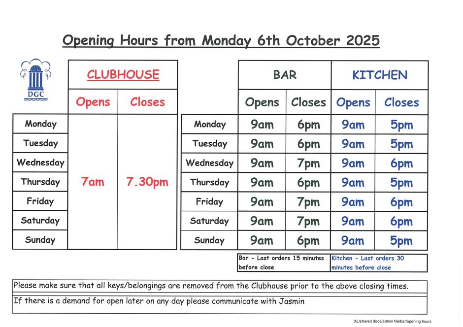 Clubhouse, bar & catering hours - from Monday 6th October 2025 onwards.